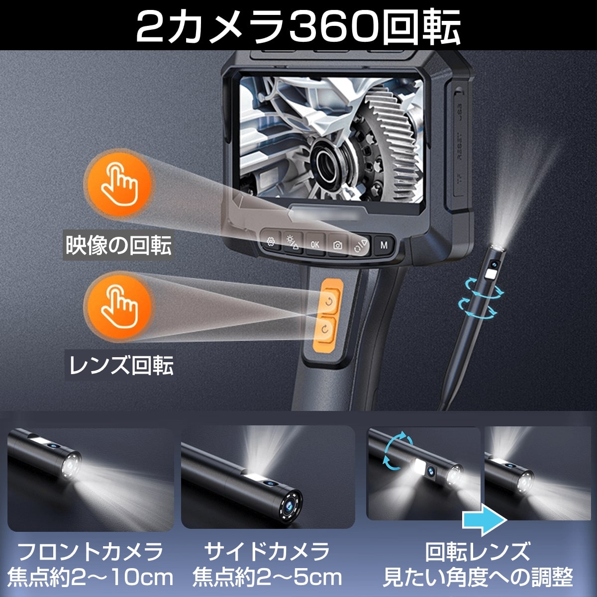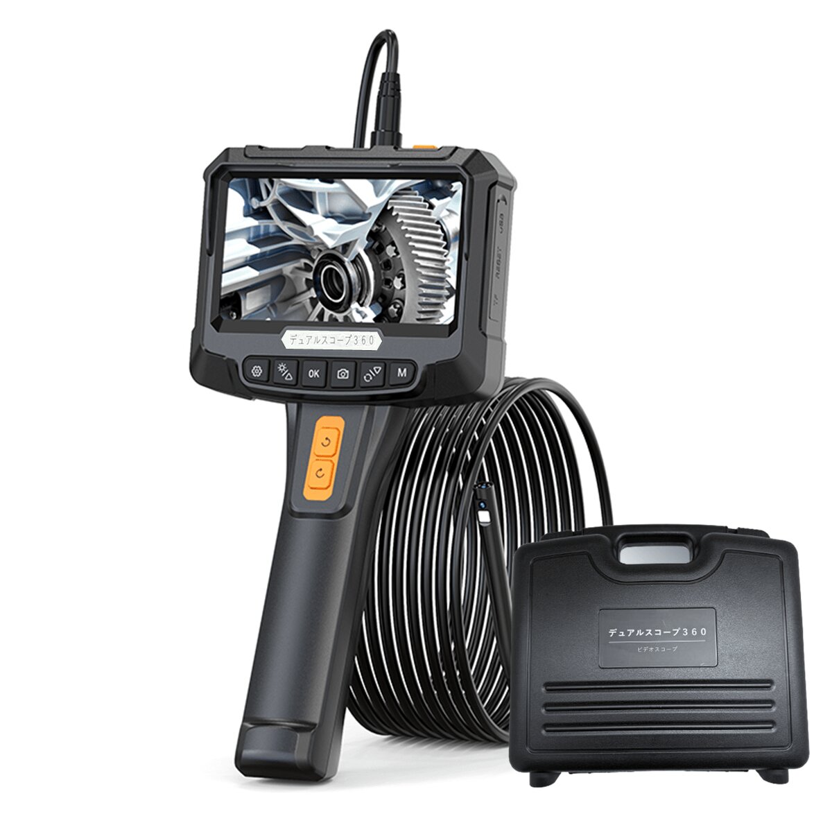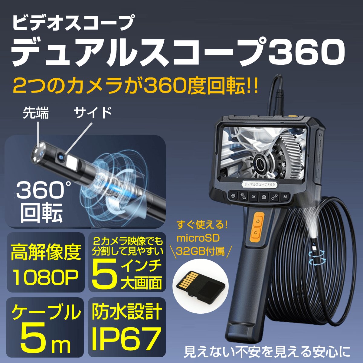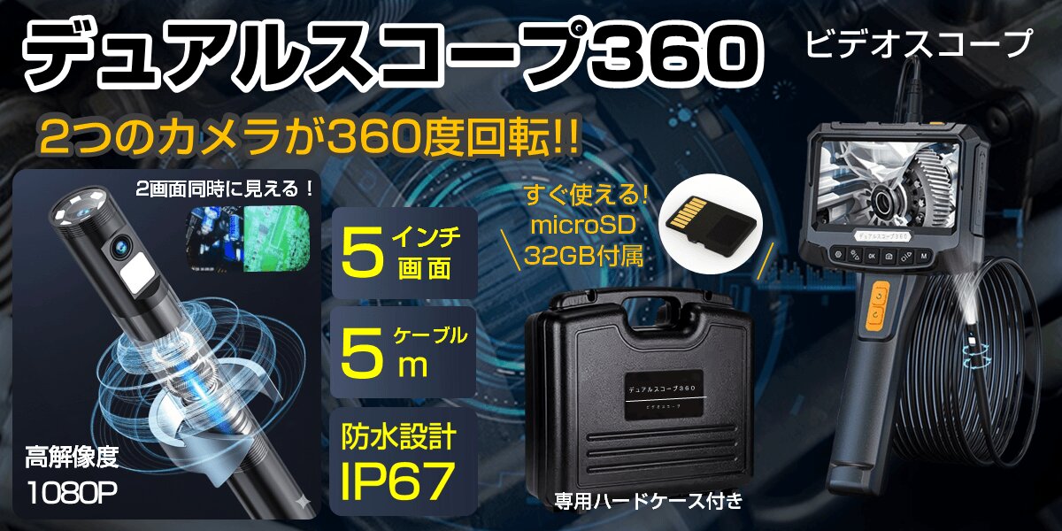 2つのカメラが360度回転!! 狭所・暗所・高所などを点検確認できる「デュアルスコープ360」は、狭所・暗所・高所など従来の目視では確認が難しい場所を安全かつ効率的に点検できる内視鏡です。スコープケーブルの長さ約5m、IP67防水、ライト付き、5インチモニター画面付きで2カメラ同時表示に対応、動画や写真を保存できる32GBメモリーカード付属、約3時間動作の充電式バッテリー、収納に便利なハードケース付属などの特長のあるビデオスコープです。自動車点検、中古車購入時、エアコン内部のカビ、排水管、家屋の安全確認、ペットの安全対策、DIY・分割修理、マンション管理、子供の自由研究など、多用途に使えるビデオスコープです。