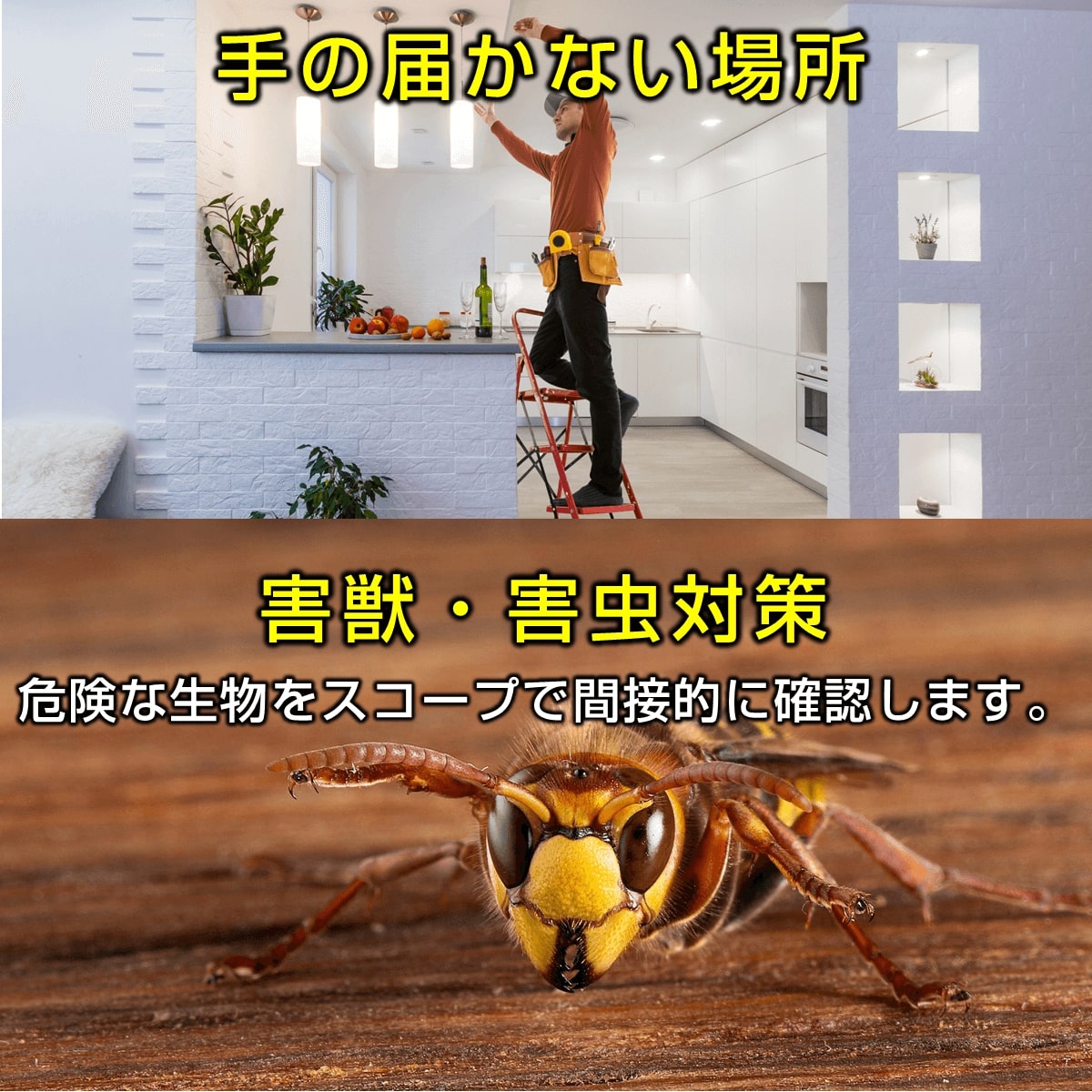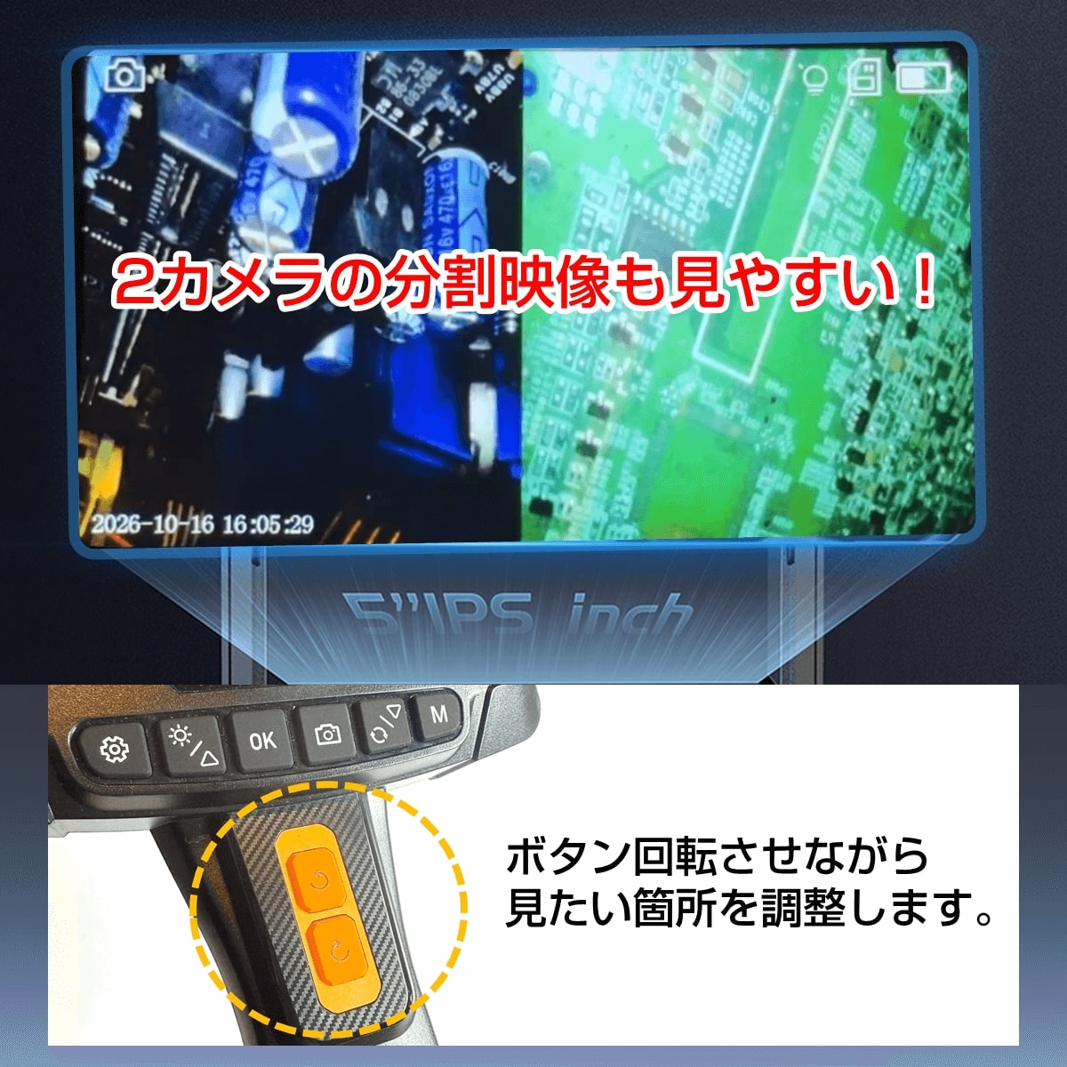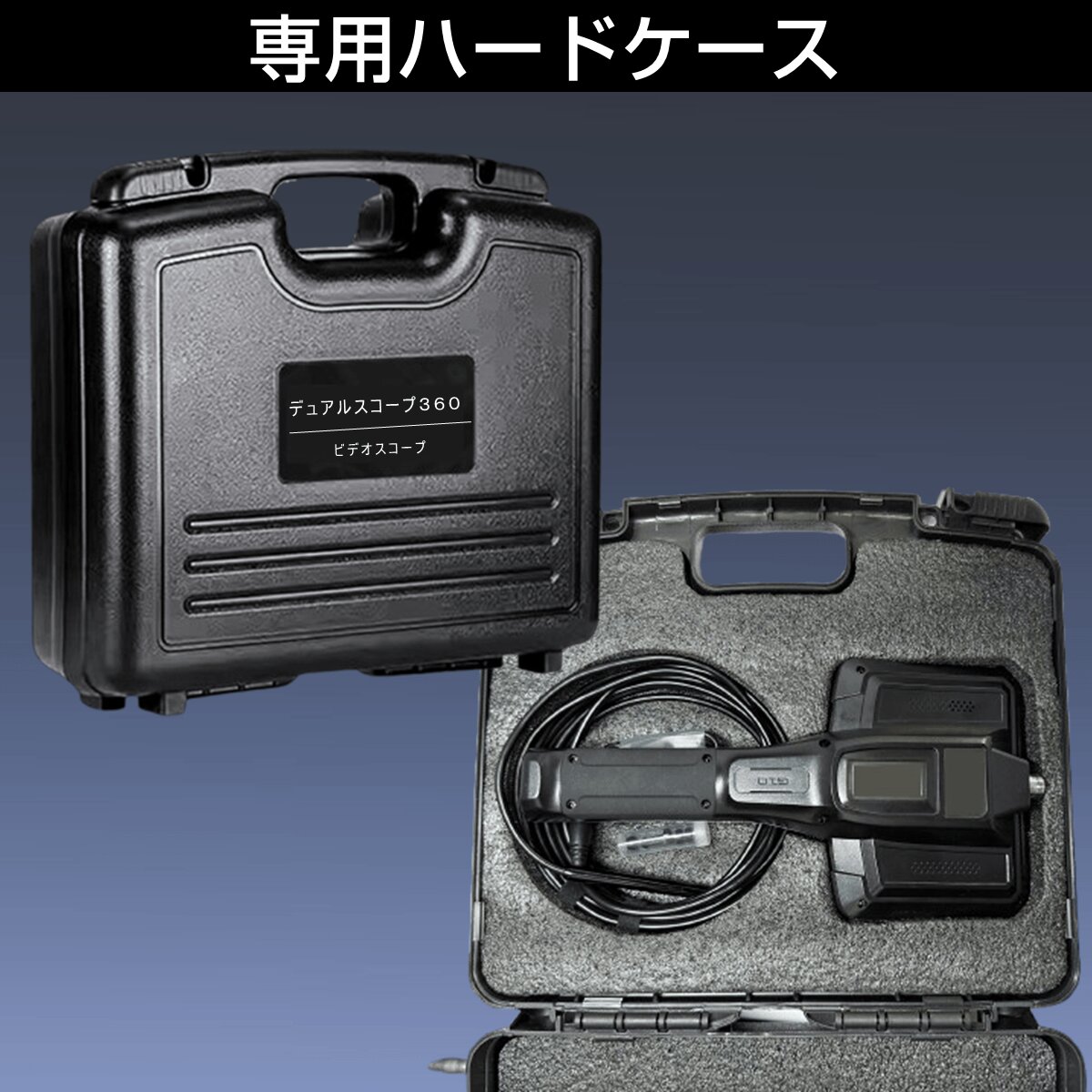 2つのカメラが360度回転!! 狭所・暗所・高所などを点検確認できる「デュアルスコープ360」は、狭所・暗所・高所など従来の目視では確認が難しい場所を安全かつ効率的に点検できる内視鏡です。スコープケーブルの長さ約5m、IP67防水、ライト付き、5インチモニター画面付きで2カメラ同時表示に対応、動画や写真を保存できる32GBメモリーカード付属、約3時間動作の充電式バッテリー、収納に便利なハードケース付属などの特長のあるビデオスコープです。自動車点検、中古車購入時、エアコン内部のカビ、排水管、家屋の安全確認、ペットの安全対策、DIY・分割修理、マンション管理、子供の自由研究など、多用途に使えるビデオスコープです。