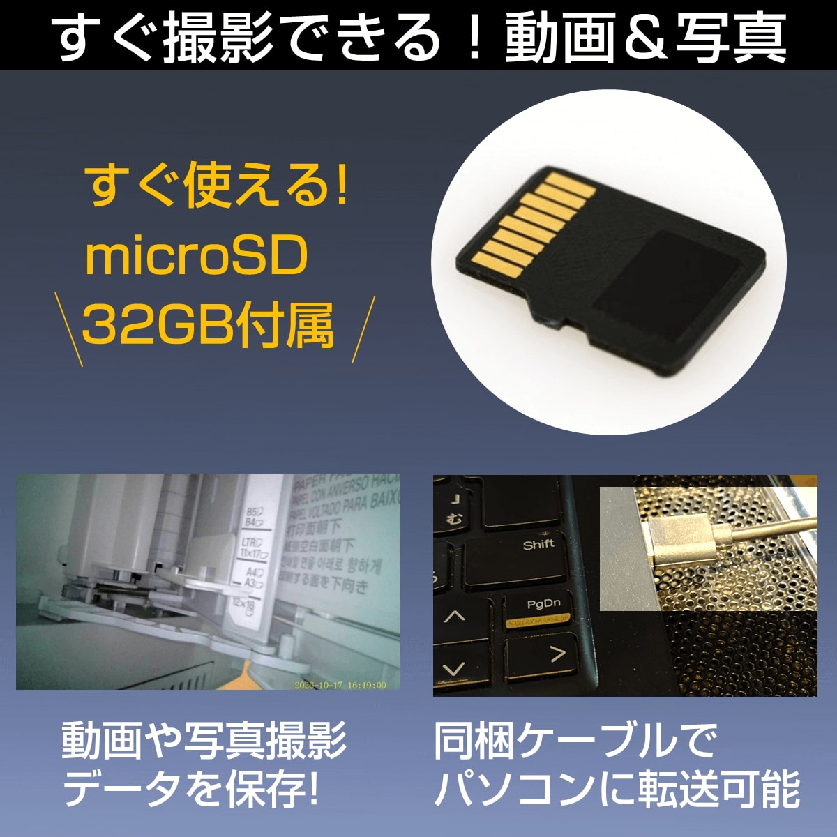 【32GB付属】:映像を見ながら点検でき、写真・動画の保存や共有も簡単。