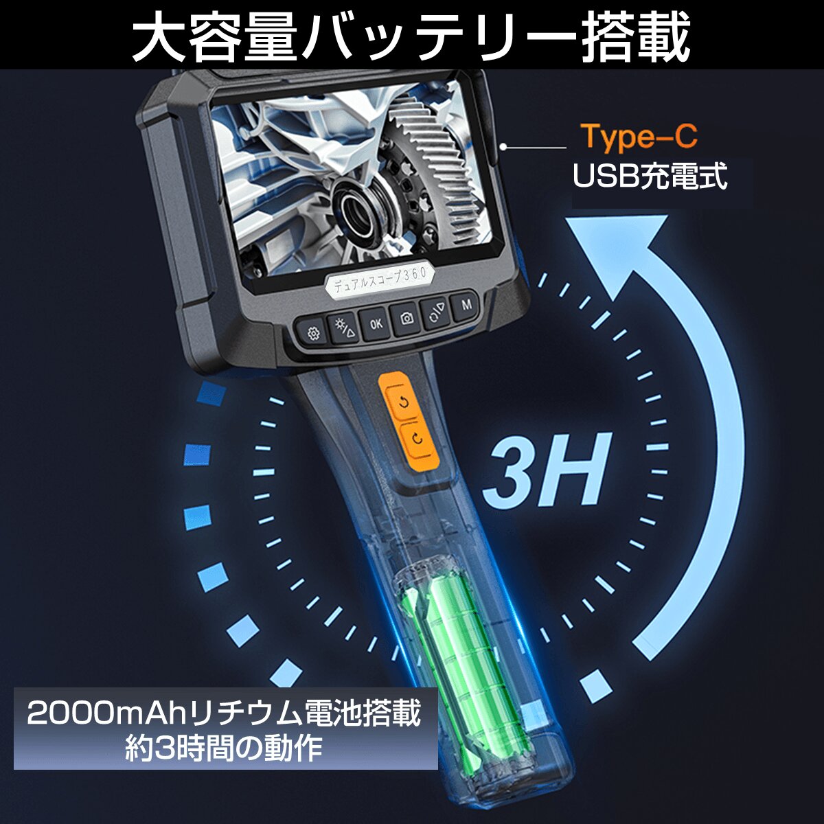 【動作時間】:約3時間動作の充電式バッテリー