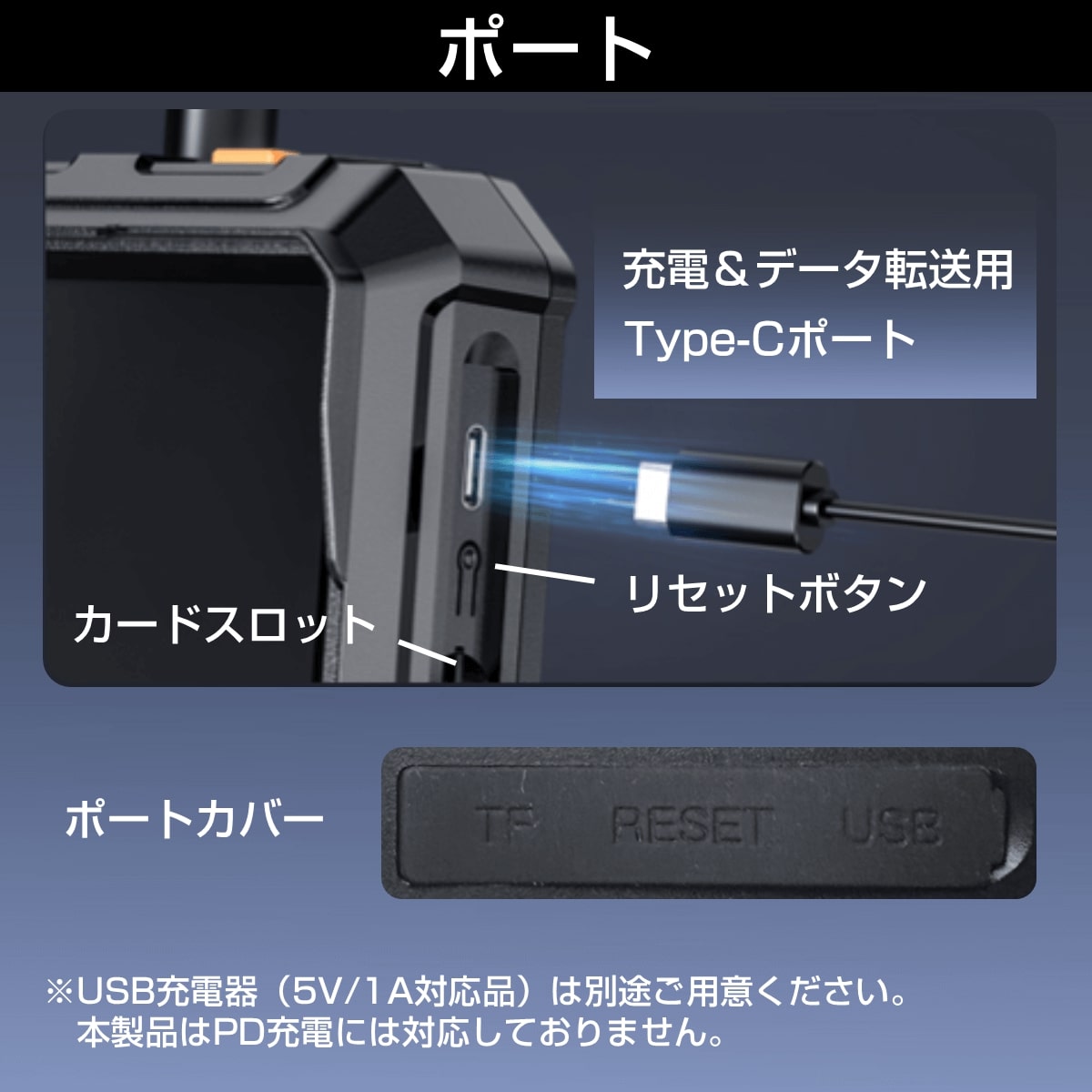 バッテリー充電 5V/1A、TypeC コネクタ