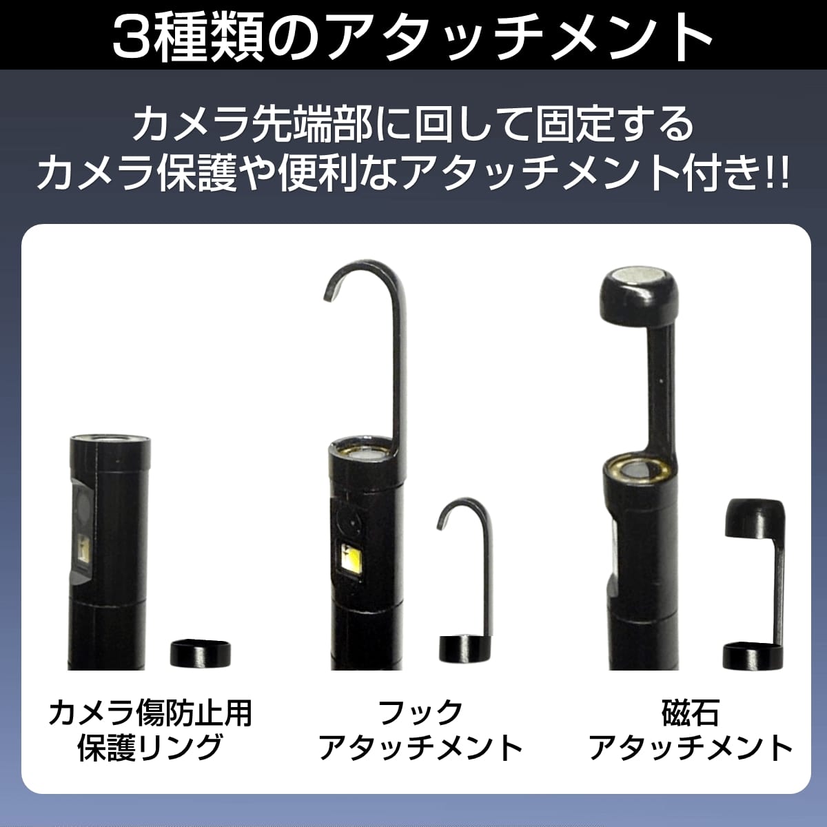 【3種類のアタッチメント】 :カメラ保護用と物をひっかけるフックや磁石タイプのアタッチメント付属