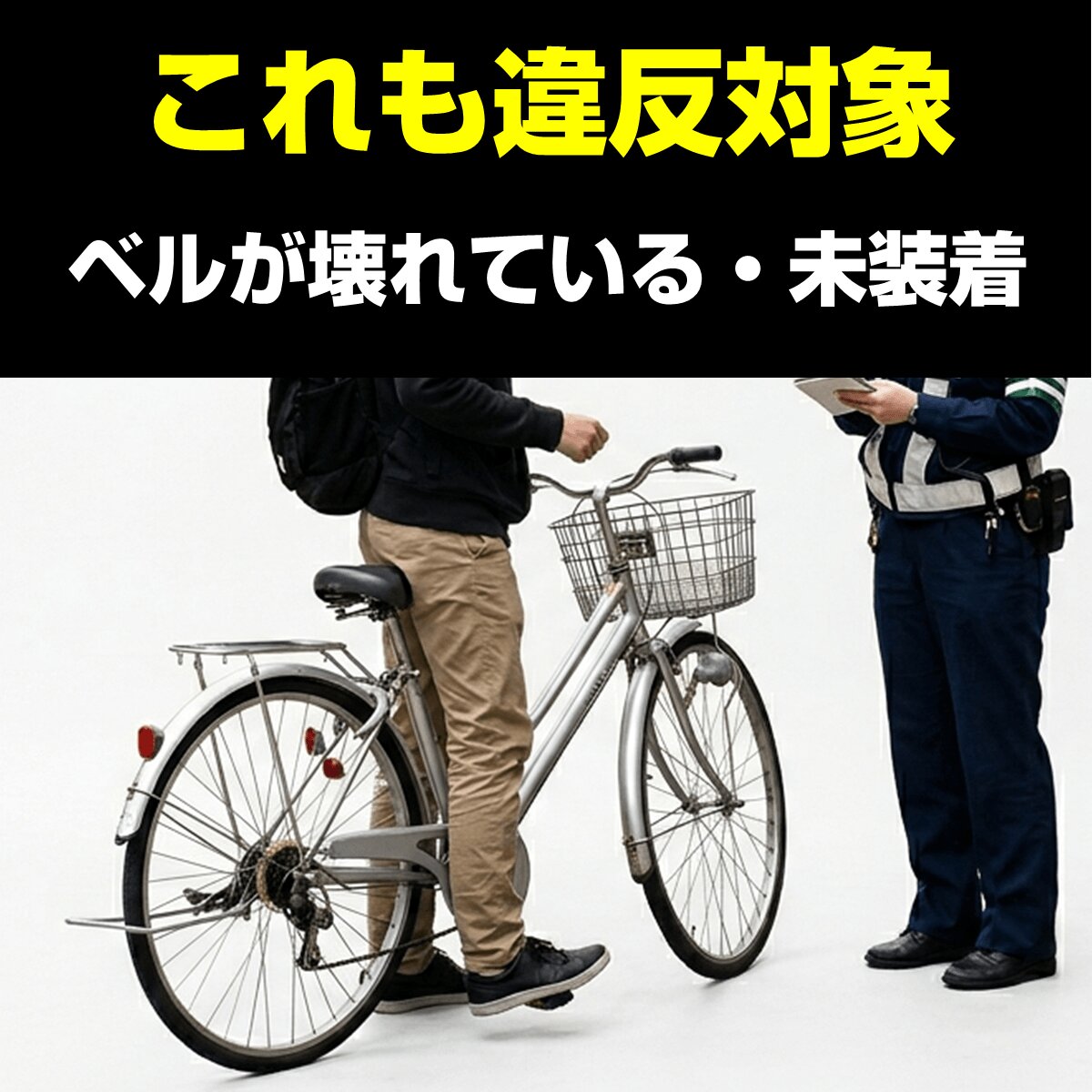 自転車ベル(警音器)の未装着や壊れている場合も違反対象となります。